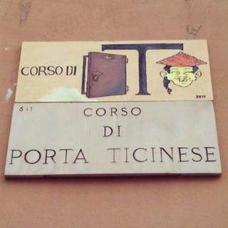 在民间,没有了身份包袱的民众,用刻板形象拿亚裔开涮,吃相就更加难看。不妨看看下面这张图:米兰城南的提契诺门区域,是这座城市近些年来发展最繁荣的街区之一,有意大利“街头艺术家”用提契诺门的意大利语名Porta Ticinese打趣,将其中的“cinese”拆解为一个“中国人”的刻板形象,斗笠官帽+眯眯眼+辫子头,带着谄媚的笑容,恨不得把傅满洲的形象写在米兰的路牌上。